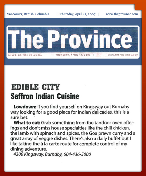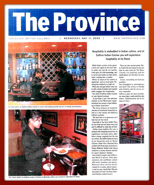 The Province Review (October 2nd, 2008) -“The singular truth is that the East Indian food was outstanding”.